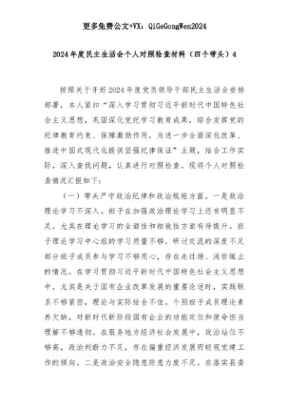 【七哥公文】2025年:2024年度民主生活会个人对照检查材料(四个带头)4+更多免费公文+VX:QiGeGongWen2024+更多免费公文+VX:QiGeGongWen2024