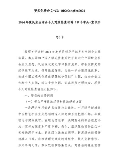 【七哥公文】2025年:2024年度民主生活会个人对照检查材料(四个带头+意识形态)2+更多免费公文+VX:QiGeGongWen2024+更多免费公文+VX:QiGeGongWen2024