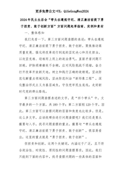 【七哥公文】2025年:2024年民主生活会“带头在遵规守纪、清正廉洁前提下勇于担责、敢于创新方面”方面问题起草指南、实例和素材 +更多免费公文+VX:QiGeGongWen2024+更多免费公文+VX:QiGeGongWen2024