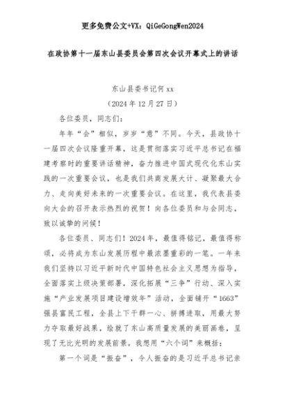 【七哥公文】2025年:在政协第十一届东山县委员会第四次会议开幕式上的讲话+更多免费公文+VX:QiGeGongWen2024+更多免费公文+VX:QiGeGongWen2024