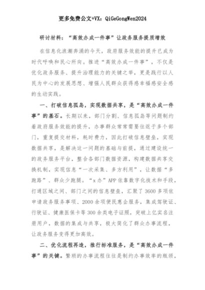 【七哥公文】2025年:研讨材料:“高效办成一件事”让政务服务提质增效+更多免费公文+VX:QiGeGongWen2024+更多免费公文+VX:QiGeGongWen2024