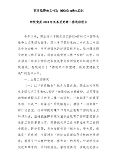 【七哥公文】2025年:学校党委2024年抓基层党建工作述职报告+更多免费公文+VX:QiGeGongWen2024+更多免费公文+VX:QiGeGongWen2024