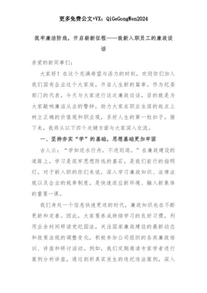 【七哥公文】2025年:筑牢廉洁防线,开启崭新征程——致新入职员工的廉政谈话+更多免费公文+VX:QiGeGongWen2024+更多免费公文+VX:QiGeGongWen2024