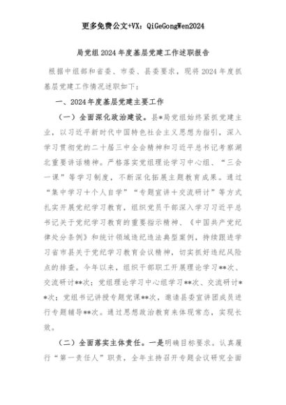 【七哥公文】2025年:局党组2024年度基层党建工作述职报告+更多免费公文+VX:QiGeGongWen2024+更多免费公文+VX:QiGeGongWen2024