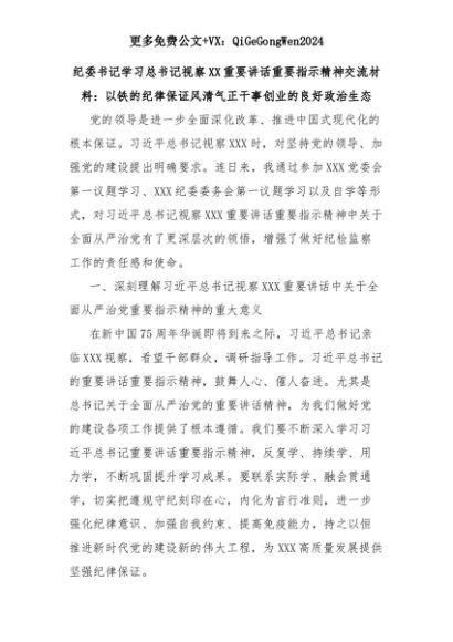 【七哥公文】2025年:纪委书记学习总书记视察XX重要讲话重要指示精神交流材料:以铁的纪律保证风清气正干事创业的良好政治生态+更多免费公文+VX:QiGeGongWen2024+更多免费公文+VX:QiGeGongWen2024
