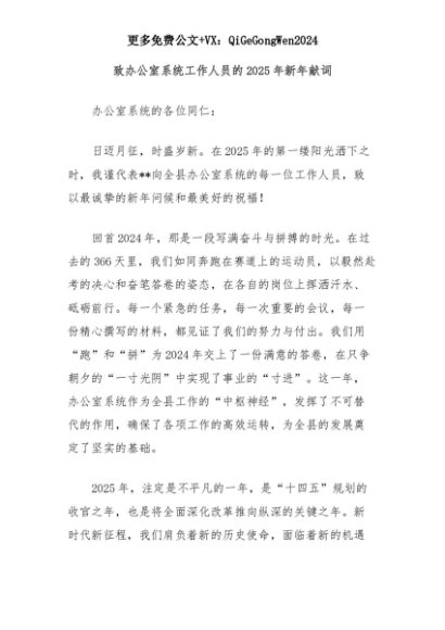 【七哥公文】2025年:致办公室系统工作人员的2025年新年献词+更多免费公文+VX:QiGeGongWen2024+更多免费公文+VX:QiGeGongWen2024
