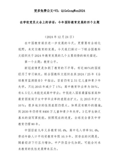 【七哥公文】2025年:在学校党员大会上的讲话:今年国际教育发展的四个主题+更多免费公文+VX:QiGeGongWen2024+更多免费公文+VX:QiGeGongWen2024