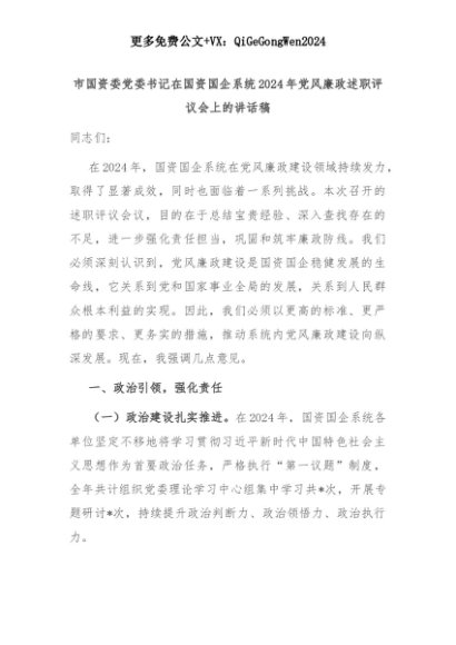 【七哥公文】2025年:市国资委党委书记在国资国企系统2024年党风廉政述职评议会上的讲话稿+更多免费公文+VX:QiGeGongWen2024+更多免费公文+VX:QiGeGongWen2024