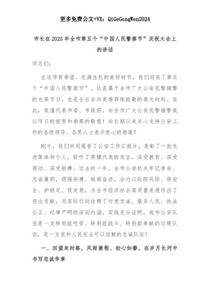 【七哥公文】2025年:市长在2025年全市第五个“中国人民警察节”庆祝大会上的讲话+更多免费公文+VX:QiGeGongWen2024+更多免费公文+VX:QiGeGongWen2024