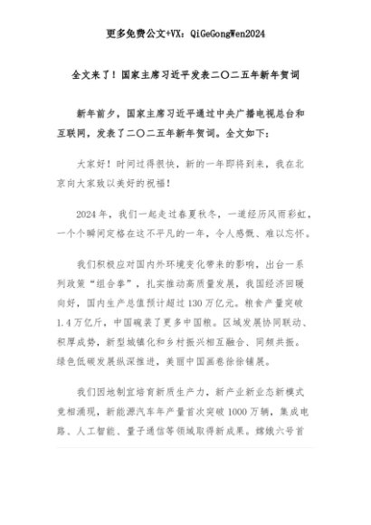 【七哥公文】2025年:国家主席习近平发表二〇二五年新年贺词+更多免费公文+VX:QiGeGongWen2024+更多免费公文+VX:QiGeGongWen2024