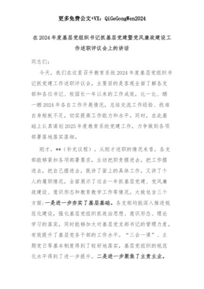 【七哥公文】2025年:在2024年度基层党组织书记抓基层党建暨党风廉政建设工作述职评议会上的讲话+更多免费公文+VX:QiGeGongWen2024+更多免费公文+VX:QiGeGongWen2024
