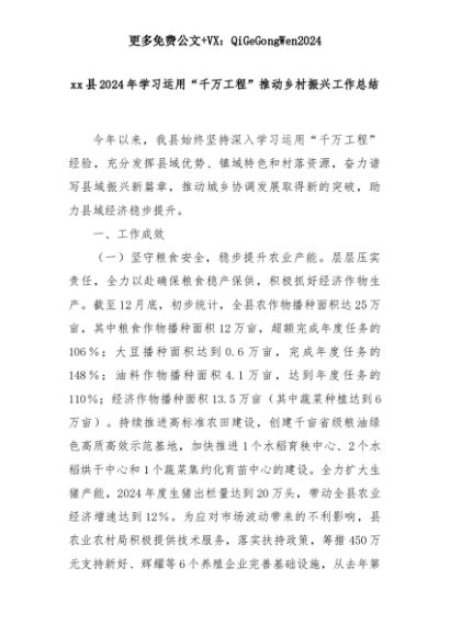 【七哥公文】2025年:xx县2024年学习运用“千万工程”推动乡村振兴工作总结+更多免费公文+VX:QiGeGongWen2024+更多免费公文+VX:QiGeGongWen2024