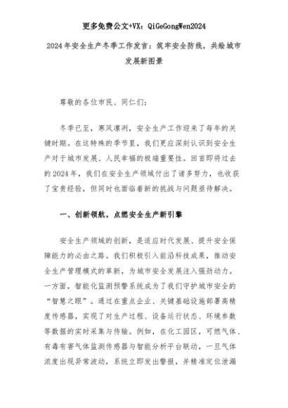 【七哥公文】2025年:2024年安全生产冬季工作发言:筑牢安全防线,共绘城市发展新图景+更多免费公文+VX:QiGeGongWen2024+更多免费公文+VX:QiGeGongWen2024