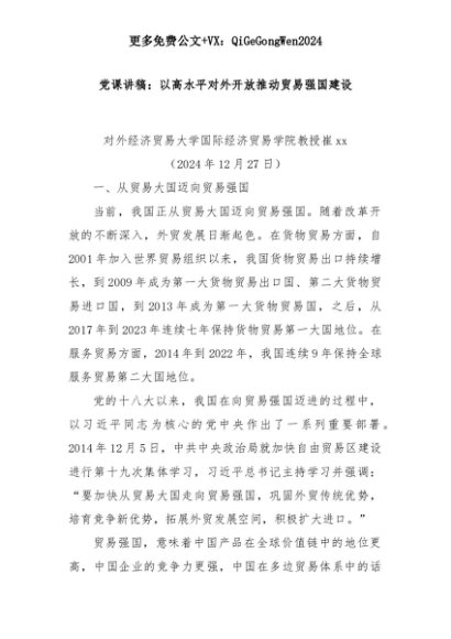 【七哥公文】2025年:党课讲稿:以高水平对外开放推动贸易强国建设+更多免费公文+VX:QiGeGongWen2024+更多免费公文+VX:QiGeGongWen2024