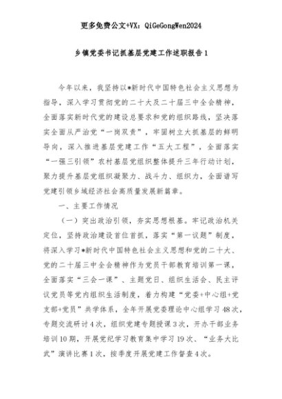 【七哥公文】2025年:乡镇党委书记抓基层党建工作述职报告1+更多免费公文+VX:QiGeGongWen2024+更多免费公文+VX:QiGeGongWen2024