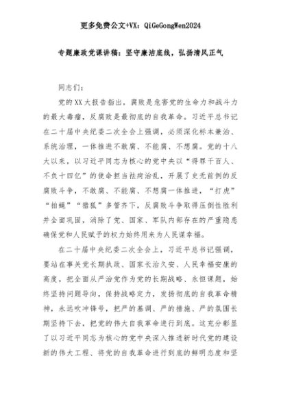 【七哥公文】2025年:专题廉政党课讲稿:坚守廉洁底线,弘扬清风正气+更多免费公文+VX:QiGeGongWen2024+更多免费公文+VX:QiGeGongWen2024