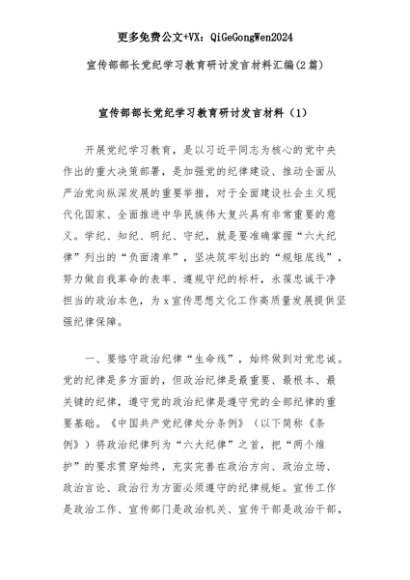 【七哥公文】2025年:(2篇)宣传部部长党纪学习教育研讨发言材料汇编+更多免费公文+VX:QiGeGongWen2024+更多免费公文+VX:QiGeGongWen2024