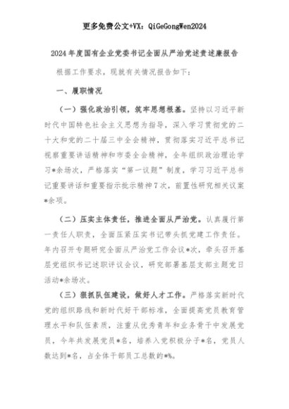 【七哥公文】2025年:2024年度国有企业党委书记全面从严治党述责述廉报告+更多免费公文+VX:QiGeGongWen2024+更多免费公文+VX:QiGeGongWen2024
