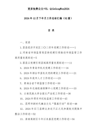 【七哥公文】2025年:(92篇)2024年12月下半月工作总结汇编+更多免费公文+VX:QiGeGongWen2024+更多免费公文+VX:QiGeGongWen2024