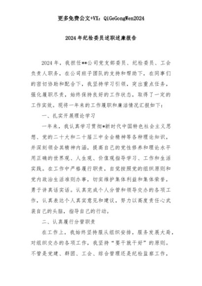 【七哥公文】2025年:2024年纪检委员述职述廉报告+更多免费公文+VX:QiGeGongWen2024+更多免费公文+VX:QiGeGongWen2024