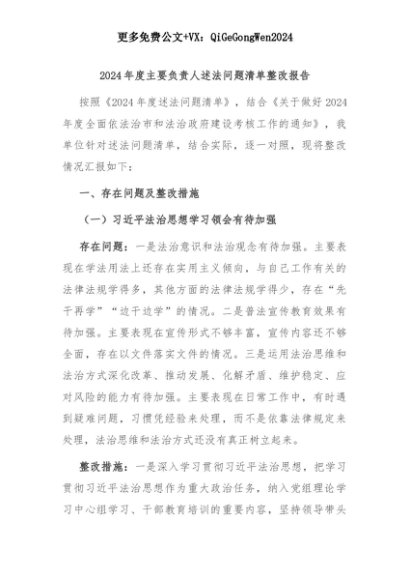 【七哥公文】2025年:2024年度主要负责人述法问题清单整改报告+更多免费公文+VX:QiGeGongWen2024+更多免费公文+VX:QiGeGongWen2024