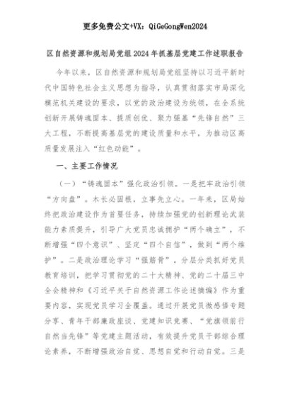 【七哥公文】2025年:区自然资源和规划局党组2024年抓基层党建工作述职报告+更多免费公文+VX:QiGeGongWen2024+更多免费公文+VX:QiGeGongWen2024