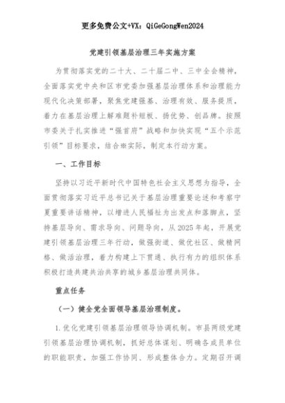 【七哥公文】2025年:党建引领基层治理三年实施方案+更多免费公文+VX:QiGeGongWen2024+更多免费公文+VX:QiGeGongWen2024