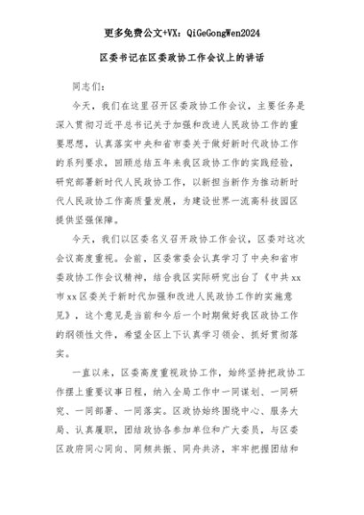 【七哥公文】2025年:区委书记在区委政协工作会议上的讲话+更多免费公文+VX:QiGeGongWen2024+更多免费公文+VX:QiGeGongWen2024