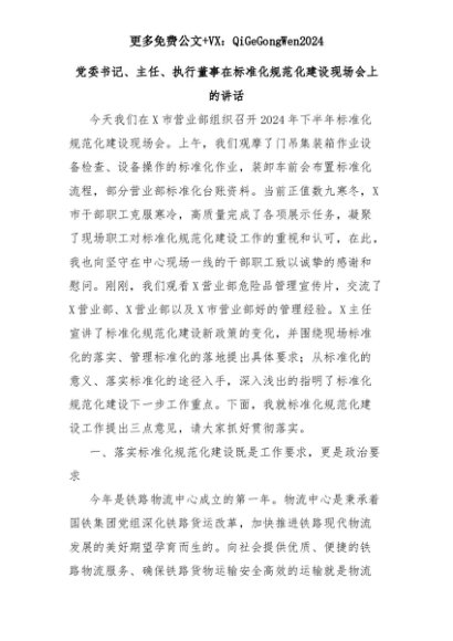 【七哥公文】2025年:党委书记、主任、执行董事在标准化规范化建设现场会上的讲话+更多免费公文+VX:QiGeGongWen2024+更多免费公文+VX:QiGeGongWen2024