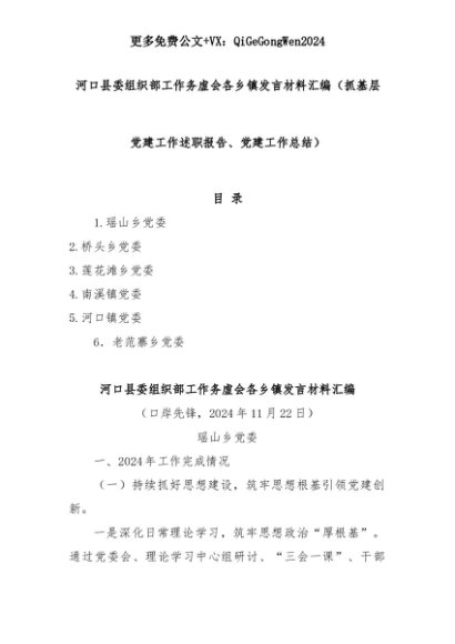 【七哥公文】2025年:(6篇)河口县委组织部工作务虚会各乡镇发言材料汇编(抓基层党建工作述职报告、党建工作总结)+更多免费公文+VX:QiGeGongWen2024+更多免费公文+VX:QiGeGongWen2024