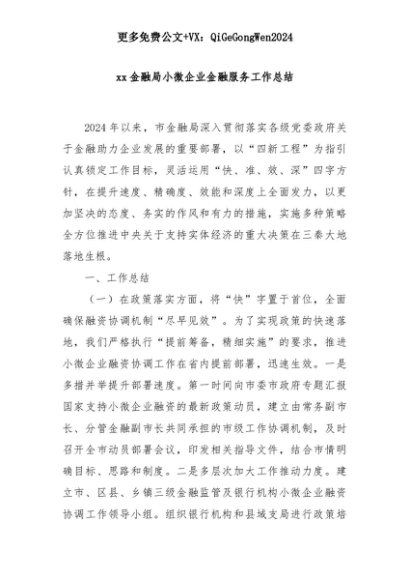 【七哥公文】2025年:xx金融局小微企业金融服务工作总结+更多免费公文+VX:QiGeGongWen2024+更多免费公文+VX:QiGeGongWen2024