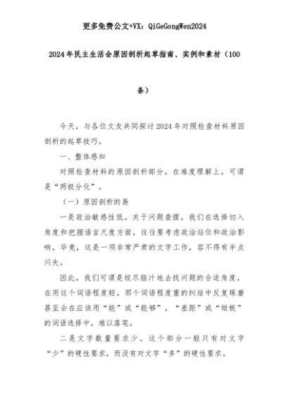 【七哥公文】2025年:(100条)2024年民主生活会原因剖析起草指南、实例和素材+更多免费公文+VX:QiGeGongWen2024+更多免费公文+VX:QiGeGongWen2024
