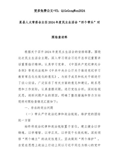【七哥公文】2025年:某县人大常委会主任2024年度民主生活会“四个带头”对照检查材料+更多免费公文+VX:QiGeGongWen2024+更多免费公文+VX:QiGeGongWen2024