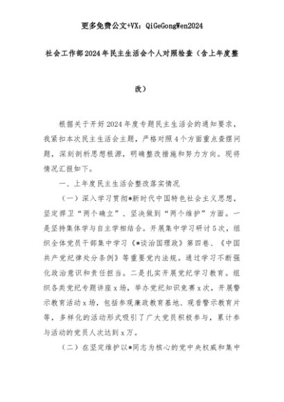 【七哥公文】2025年:社会工作部2024年民主生活会个人对照检查(含上年度整改)+更多免费公文+VX:QiGeGongWen2024+更多免费公文+VX:QiGeGongWen2024