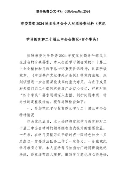 【七哥公文】2025年:市委某部2024民主生活会个人对照检查材料(党纪学习教育和二十届三中全会情况+四个带头)+更多免费公文+VX:QiGeGongWen2024+更多免费公文+VX:QiGeGongWen2024