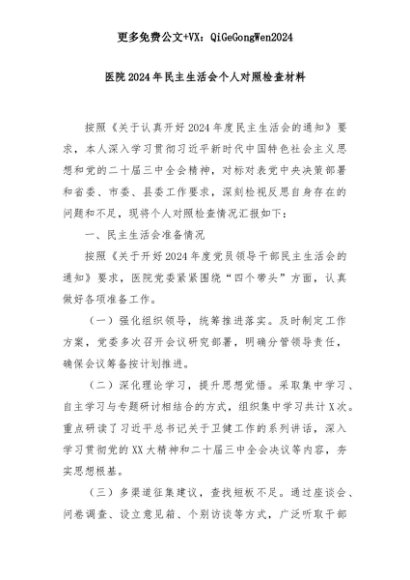 【七哥公文】2025年:医院2024年民主生活会个人对照检查材料+更多免费公文+VX:QiGeGongWen2024+更多免费公文+VX:QiGeGongWen2024