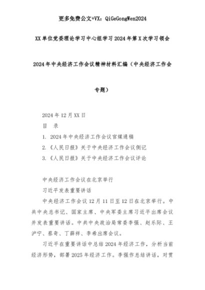 【七哥公文】2025年:XX单位党委理论学习中心组学习2024年第X次学习领会2024年中央经济工作会议精神材料汇编(中央经济工作会专题)+更多免费公文+VX:QiGeGongWen2024+更多免费公文+VX:QiGeGongWen2024