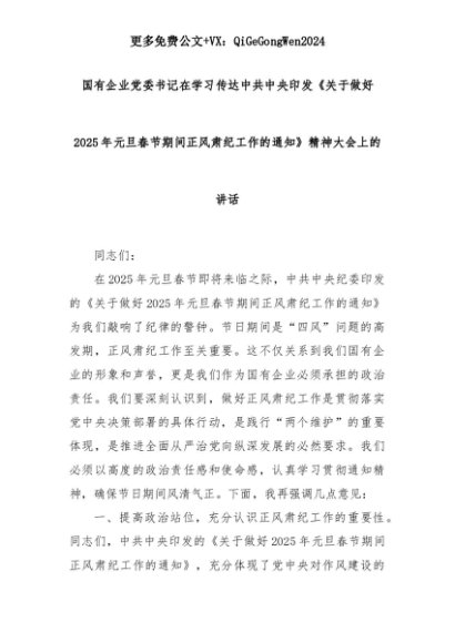 【七哥公文】2025年:国有企业党委书记在学习传达中共中央印发《关于做好2025年元旦春节期间正风肃纪工作的通知》精神大会上的讲话+更多免费公文+VX:QiGeGongWen2024+更多免费公文+VX:QiGeGongWen2024