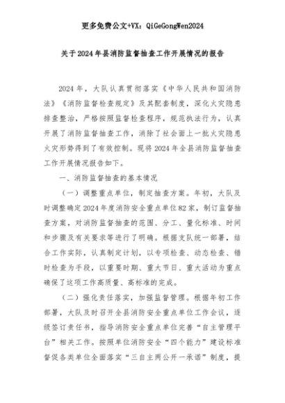 【七哥公文】2025年:关于2024年县消防监督抽查工作开展情况的报告+更多免费公文+VX:QiGeGongWen2024+更多免费公文+VX:QiGeGongWen2024