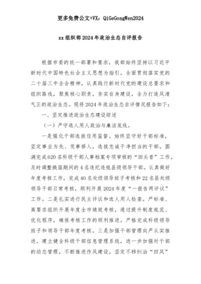 【七哥公文】2025年:xx组织部2024年政治生态自评报告+更多免费公文+VX:QiGeGongWen2024+更多免费公文+VX:QiGeGongWen2024