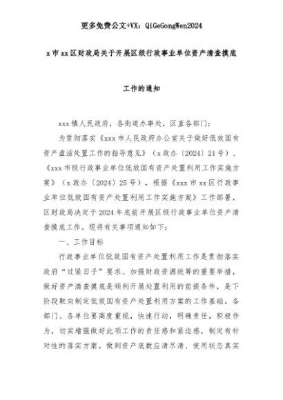 【七哥公文】2025年:xx市xx区财政局关于开展区级行政事业单位资产清查摸底工作的通知+更多免费公文+VX:QiGeGongWen2024+更多免费公文+VX:QiGeGongWen2024