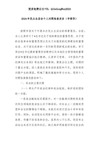 【七哥公文】2025年:2024年民主生活会个人对照检查发言(市领导)+更多免费公文+VX:QiGeGongWen2024+更多免费公文+VX:QiGeGongWen2024