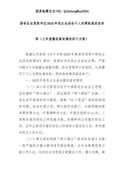 【七哥公文】2025年:国有企业党委书记2024年民主生活会个人对照检查发言材料(上年度整改落实情况四个方面)+更多免费公文+VX:QiGeGongWen2024+更多免费公文+VX:QiGeGongWen2024