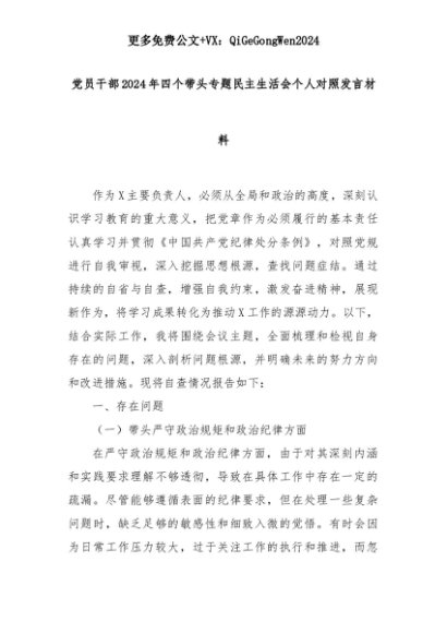 【七哥公文】2025年:党员干部2024年四个带头专题民主生活会个人对照发言材料+更多免费公文+VX:QiGeGongWen2024+更多免费公文+VX:QiGeGongWen2024