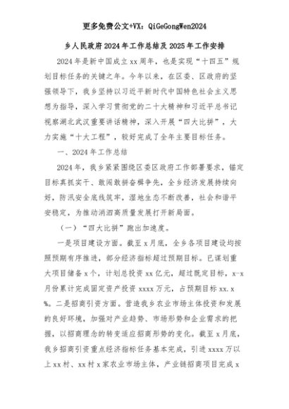 【七哥公文】2025年:乡人民政府2024年工作总结及2025年工作安排+更多免费公文+VX:QiGeGongWen2024+更多免费公文+VX:QiGeGongWen2024