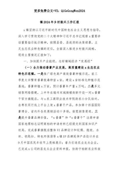 【七哥公文】2025年:镇2024年乡村振兴工作汇报+更多免费公文+VX:QiGeGongWen2024+更多免费公文+VX:QiGeGongWen2024