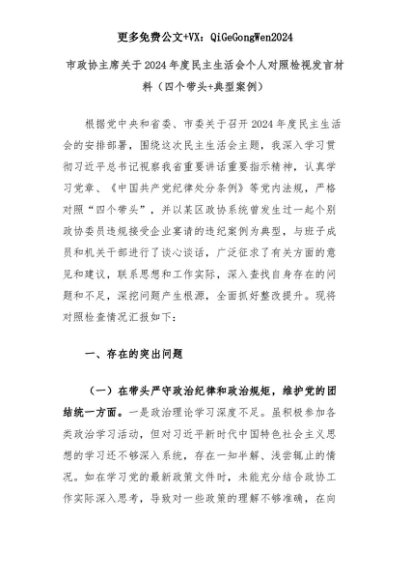 【七哥公文】2025年:市政协主席关于2024年度民主生活会个人对照检视发言材料(四个带头+典型案例)+更多免费公文+VX:QiGeGongWen2024+更多免费公文+VX:QiGeGongWen2024
