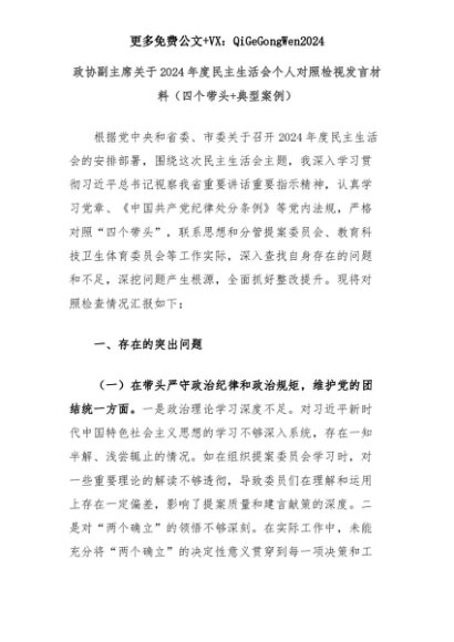 【七哥公文】2025年:政协副主席关于2024年度民主生活会个人对照检视发言材料(四个带头+典型案例)+更多免费公文+VX:QiGeGongWen2024+更多免费公文+VX:QiGeGongWen2024