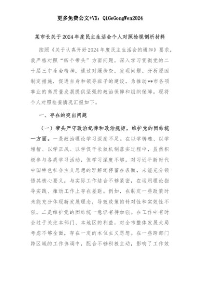【七哥公文】2025年:某市长关于2024年度民主生活会个人对照检视剖析材料+更多免费公文+VX:QiGeGongWen2024+更多免费公文+VX:QiGeGongWen2024