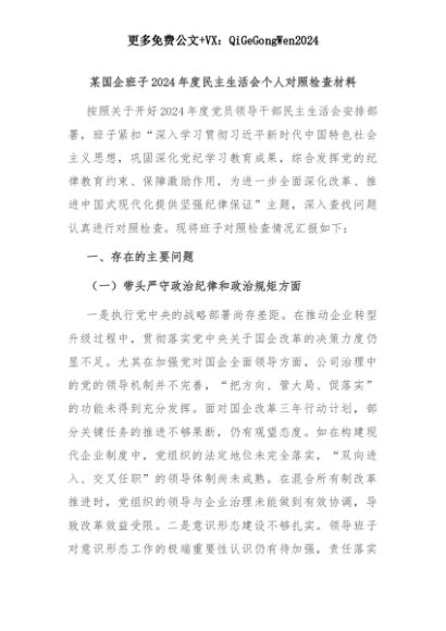【七哥公文】2025年:某国企班子2024年度民主生活会个人对照检查材料+更多免费公文+VX:QiGeGongWen2024+更多免费公文+VX:QiGeGongWen2024